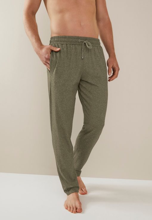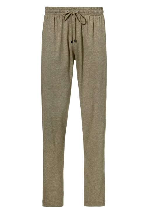 Luxurious, warming and yet light in a trendy melange look. The long pants for men have a hidden, elastic waistband with drawstring. The ends of the cords as well as the cord eyelets are finished with grey metal elements on which the Zimmerli of Switzerland logo has been engraved. In addition, the loungewear pants impress with two seam pockets and a back pocket. Latter is closed with a mother-of-pearl button. In this case, the button closure is a triangular formed fabric loop covering the button almost completely when shut. The fit is rather loose and therefore ensures a comfortable wear.
