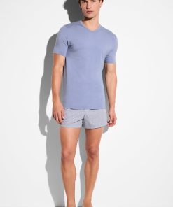The Cotton Polin line stands for breathability and ease of care, for hard-wearing, versatile and densely woven fabric with a smooth, non-slip surface that is ideal for pyjamas and boxer shorts. Geometric print meets modern cut – a style that will stay with you for a long time. The boxer shorts for men feature an elasticated waistband, a single-button fastening and a cropped leg. The cut is loose and comfortable, the woven fabric is firm and not elasticated. The leg length is slightly shorter than other Zimmerli of Switzerland boxer shorts. The men’s boxer shorts from the Cotton Poplin Print line are made of pure cotton. The woven fabric is only slightly elasticated, but offers a very smooth and even surface. The geometric print is classic and timeless.