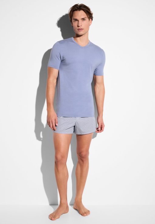 The Cotton Polin line stands for breathability and ease of care, for hard-wearing, versatile and densely woven fabric with a smooth, non-slip surface that is ideal for pyjamas and boxer shorts. Geometric print meets modern cut – a style that will stay with you for a long time. The boxer shorts for men feature an elasticated waistband, a single-button fastening and a cropped leg. The cut is loose and comfortable, the woven fabric is firm and not elasticated. The leg length is slightly shorter than other Zimmerli of Switzerland boxer shorts. The men’s boxer shorts from the Cotton Poplin Print line are made of pure cotton. The woven fabric is only slightly elasticated, but offers a very smooth and even surface. The geometric print is classic and timeless.