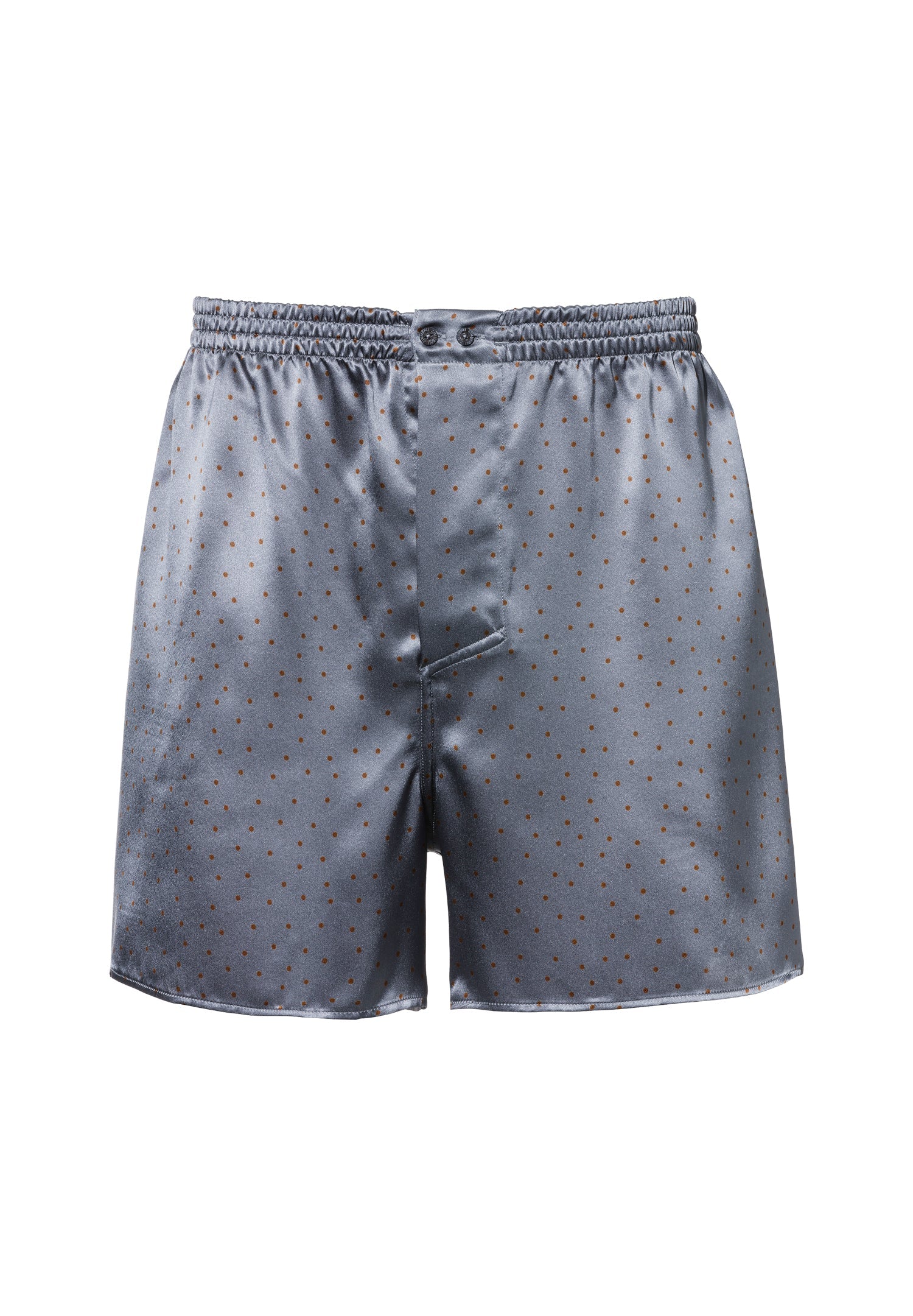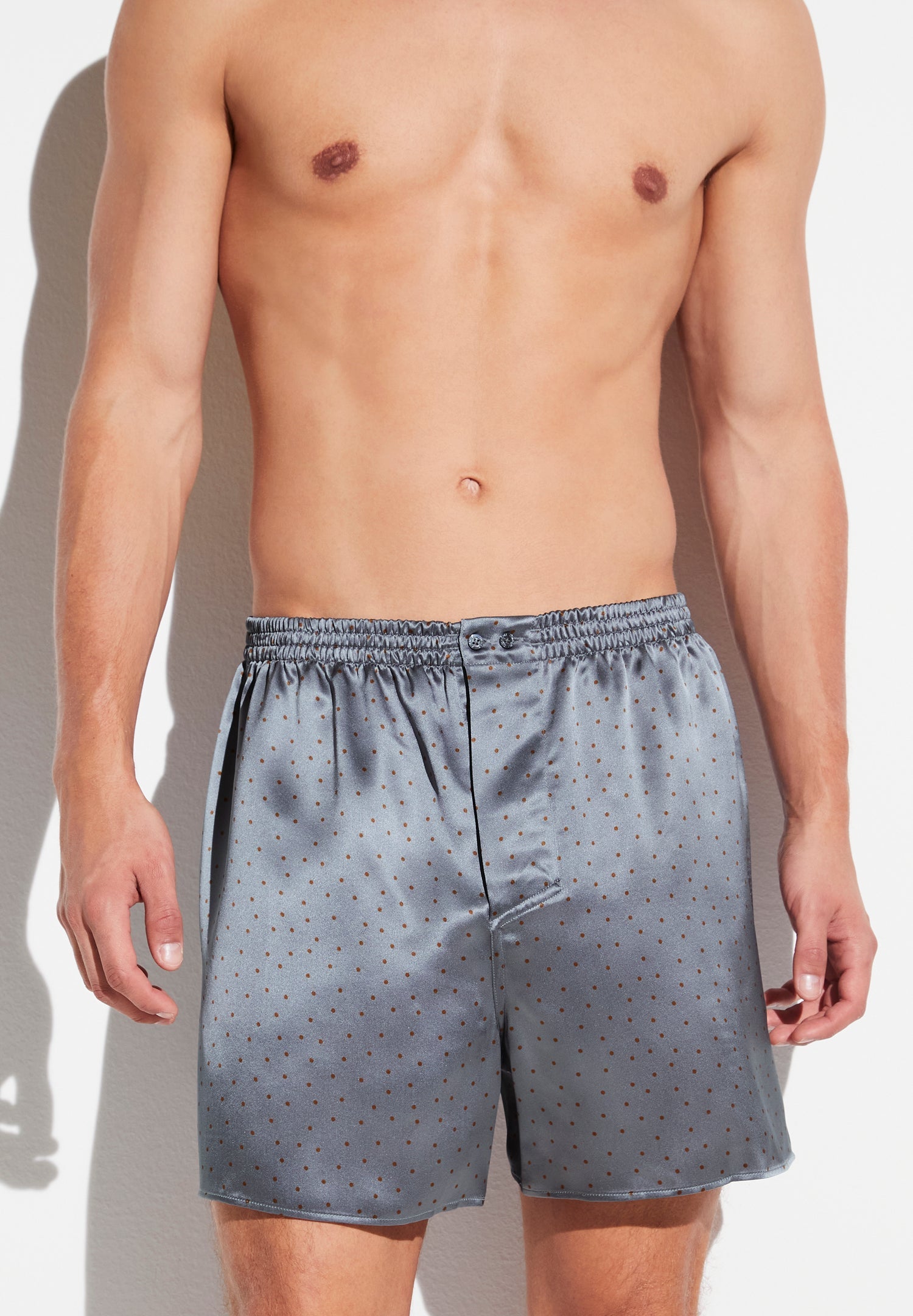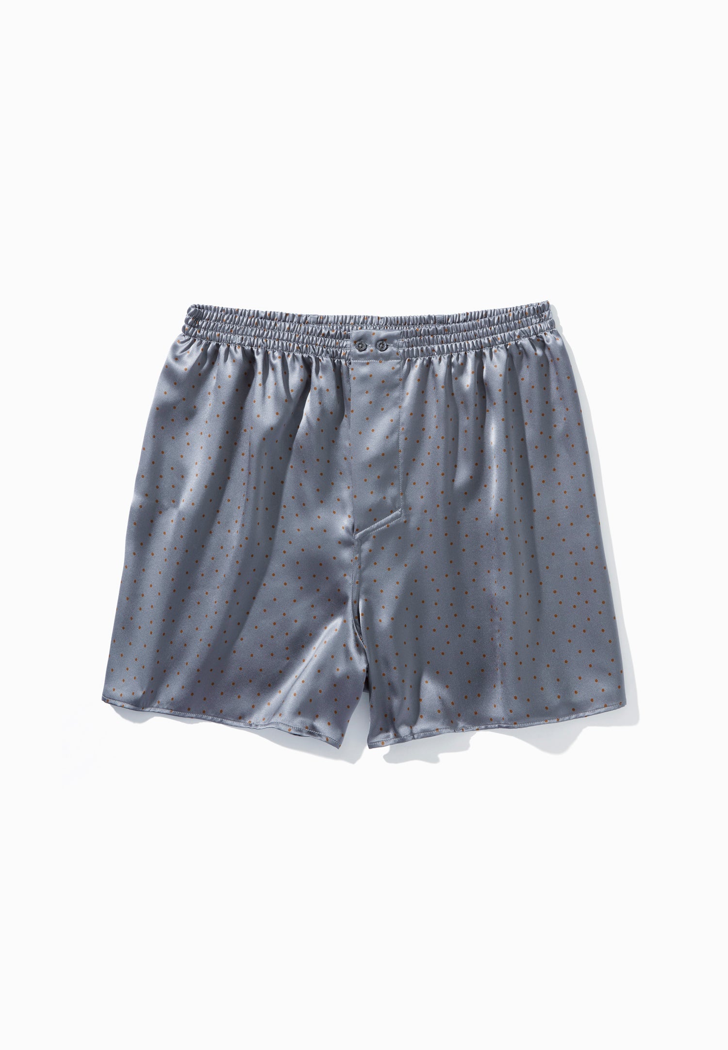 Boxer shorts made of pure silk, to promote perfect sleep and relaxation. Silk is made up of proteins in a similar way to human skin, which is why it is particularly good for sensitive skin. For these boxer shorts, a high-quality silk with 19 momme (approx. 80g/m²) is used. This silk is very delicate while still being strong. It has a dense weave and is also particularly suitable for allergy sufferers. High-quality silk of this kind has a radiant colour, a pleasant fabric weight and is very resistant to creasing. These boxer shorts come in a relaxed style and have a comfortably stretchy waistband with two pearl buttons. They have a casual drape and the colours in the discreet designs on this dyed silk have a particular brilliance. The material used in the boxer shorts offers excellent temperature regulation. In cool temperatures it feels comfortably warm; when conditions are warmer it has a pleasantly cool feel. These boxer shorts have an exceptionally stylish design and offers fabulous comfort and a sense of well-being.