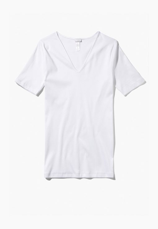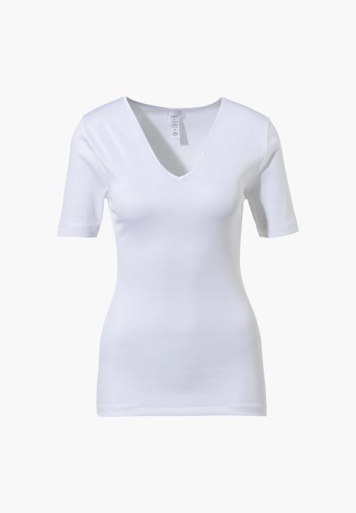 A matte finish and feminine shape characterise this exclusive top from the Cotton-de-Luxe collection. Thanks to a meticulous refinement process, the opaque cotton fabric feels wonderfully smooth and cool against the skin. The soft fine rib caresses your body with no annoying side seams because it is worked as a single loop then processed by hand. An exquisite satin ribbon adds the finishing touch to the V-neck design, bringing feminine elegance and glamour to this short-sleeved top with slightly contoured shape. Combine this lovely white top with matching briefs from the Cotton-de-Luxe collection for elegantly coordinated underwear, or wear it over other garments and accessorise to suit your taste. Thanks to the classic minimalist style, this is the perfect partner for lots of trousers and skirts.