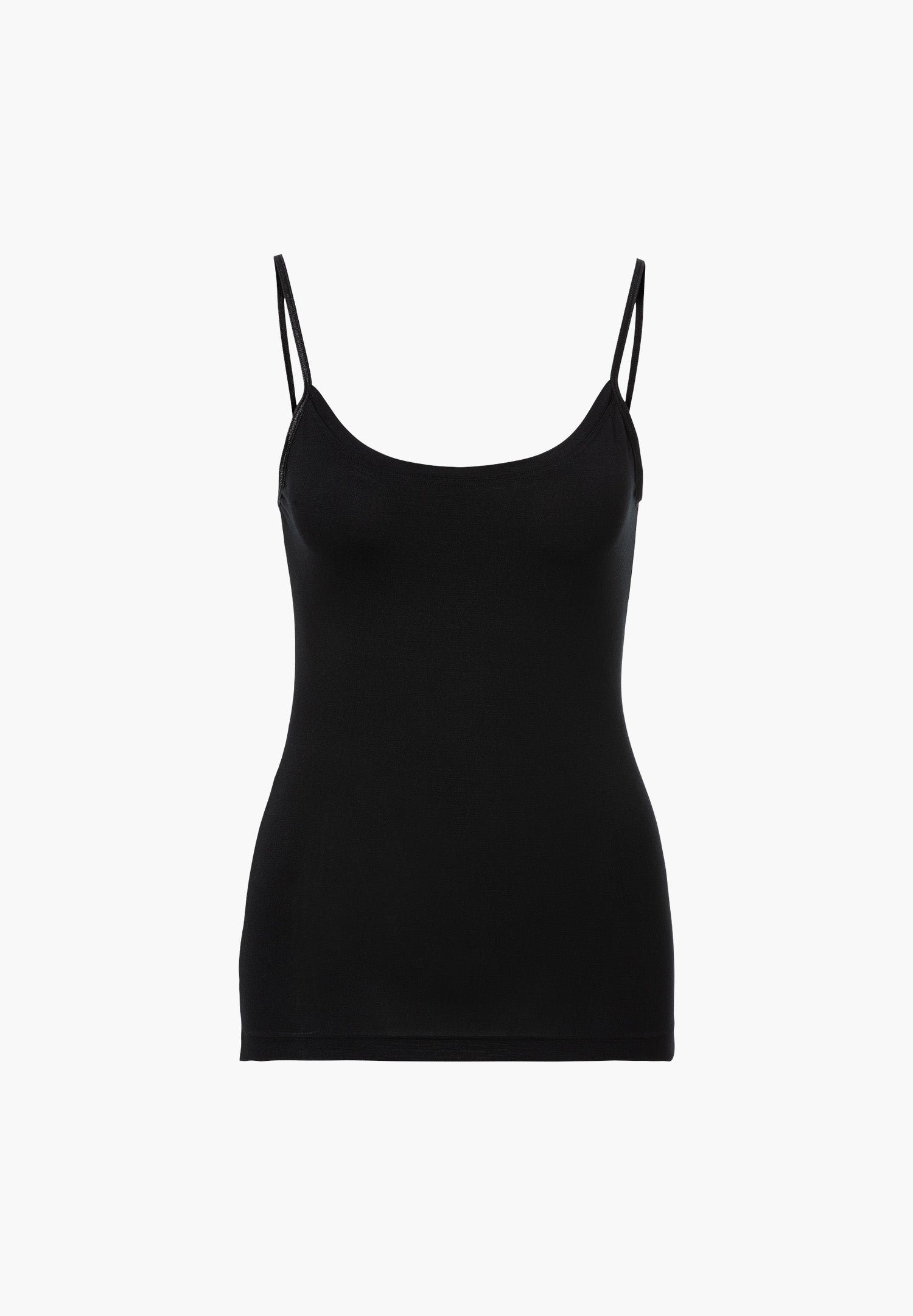 A delicate, figure-hugging spaghetti top made from a blend of Micromodal and elastane. The Micromodal used is obtained from sustainably produced, natural beechwood fibres. It is breathable and offers excellent temperature regulation. Micromodal can absorb up to 50% more moisture than other varieties of cotton. In addition, Micromodal is as soft as silk and has a beautiful drape.