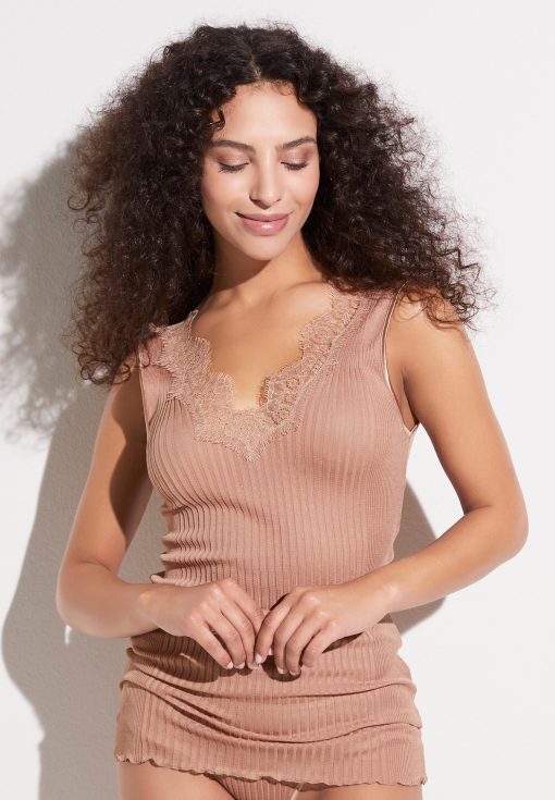 One-of-a-kind thin Richelieu fine rib fabric with two differently wide ribs decorated with delicate, floral eyelash lace. The top with broad straps for women charms with a deep, wavy V-neck which is trimmed with eyelash lace. At the centre of the neckline the lace details meet and cross each other. The back neckline as well as the armhole openings are bordered with a shimmering band. The hem is slightly ruffled as a result of a special sewing technique.