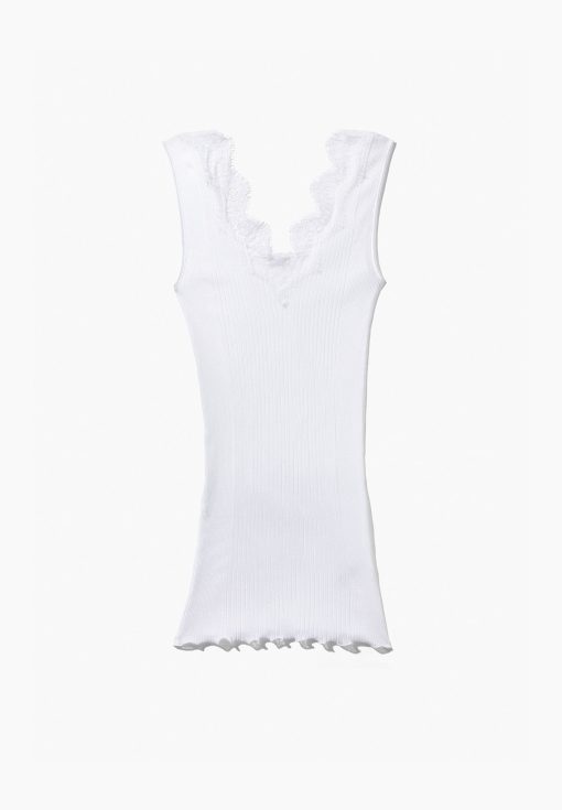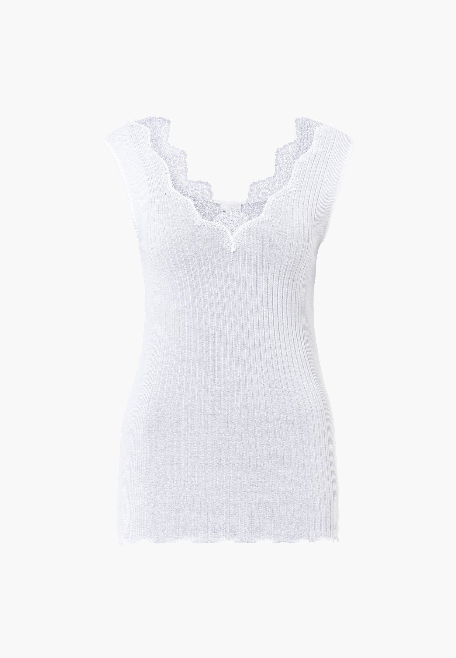 One-of-a-kind thin Richelieu fine rib fabric with two differently wide ribs decorated with delicate, floral eyelash lace. The top with broad straps for women charms with a deep, wavy V-neck which is trimmed with eyelash lace. At the centre of the neckline the lace details meet and cross each other. The back neckline as well as the armhole openings are bordered with a shimmering band. The hem is slightly ruffled as a result of a special sewing technique.