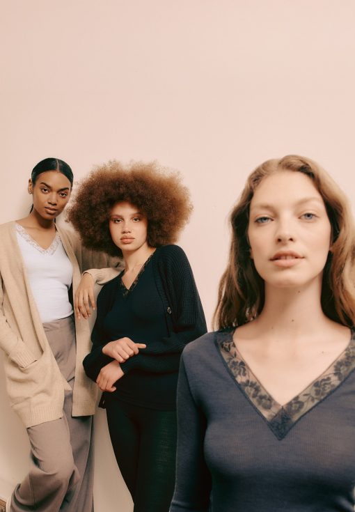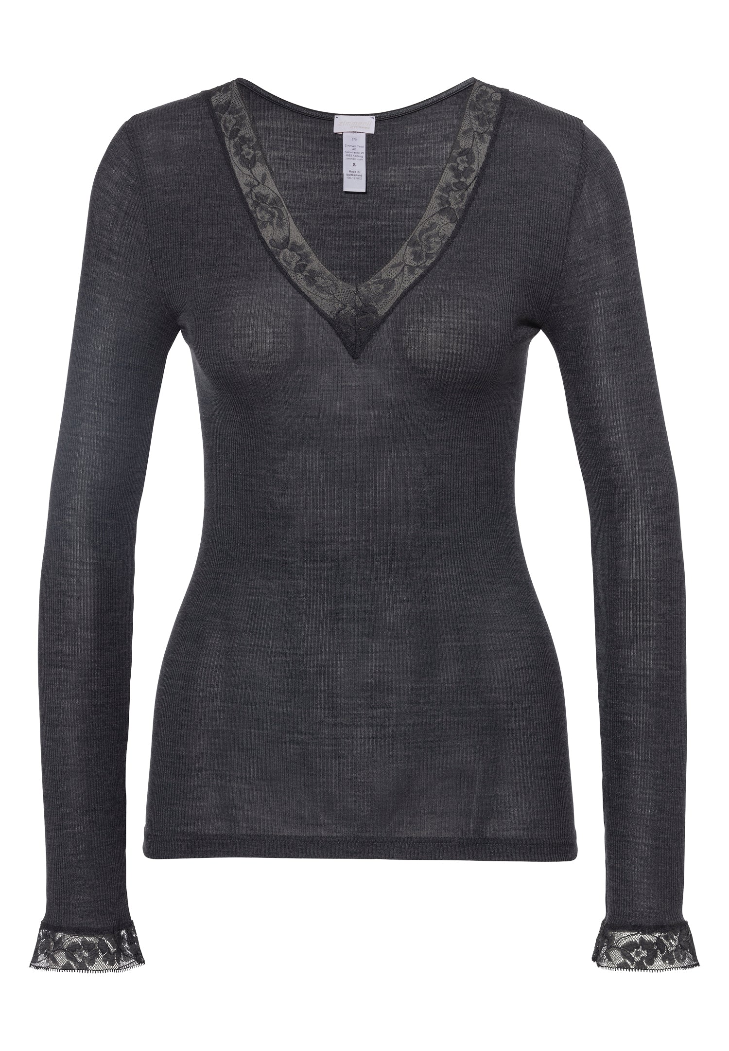 Fine rib fabric with a subtle structure and made of noble wool-silk material featuring a lace decoration of delicate blossoms. The long-sleeved shirt for women impresses with a V-neck which is trimmed with high-quality lace. At the centre of the neckline the lace details meet and cross each other. The high back neckline is bordered with a shimmering band. At the hem of the slim-fitting, long sleeves is trimmed with lace. This piece is crafted by using the seamless circular knitting process to create a comfortably tight, figure-hugging fit.