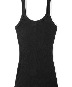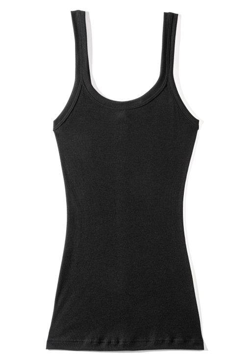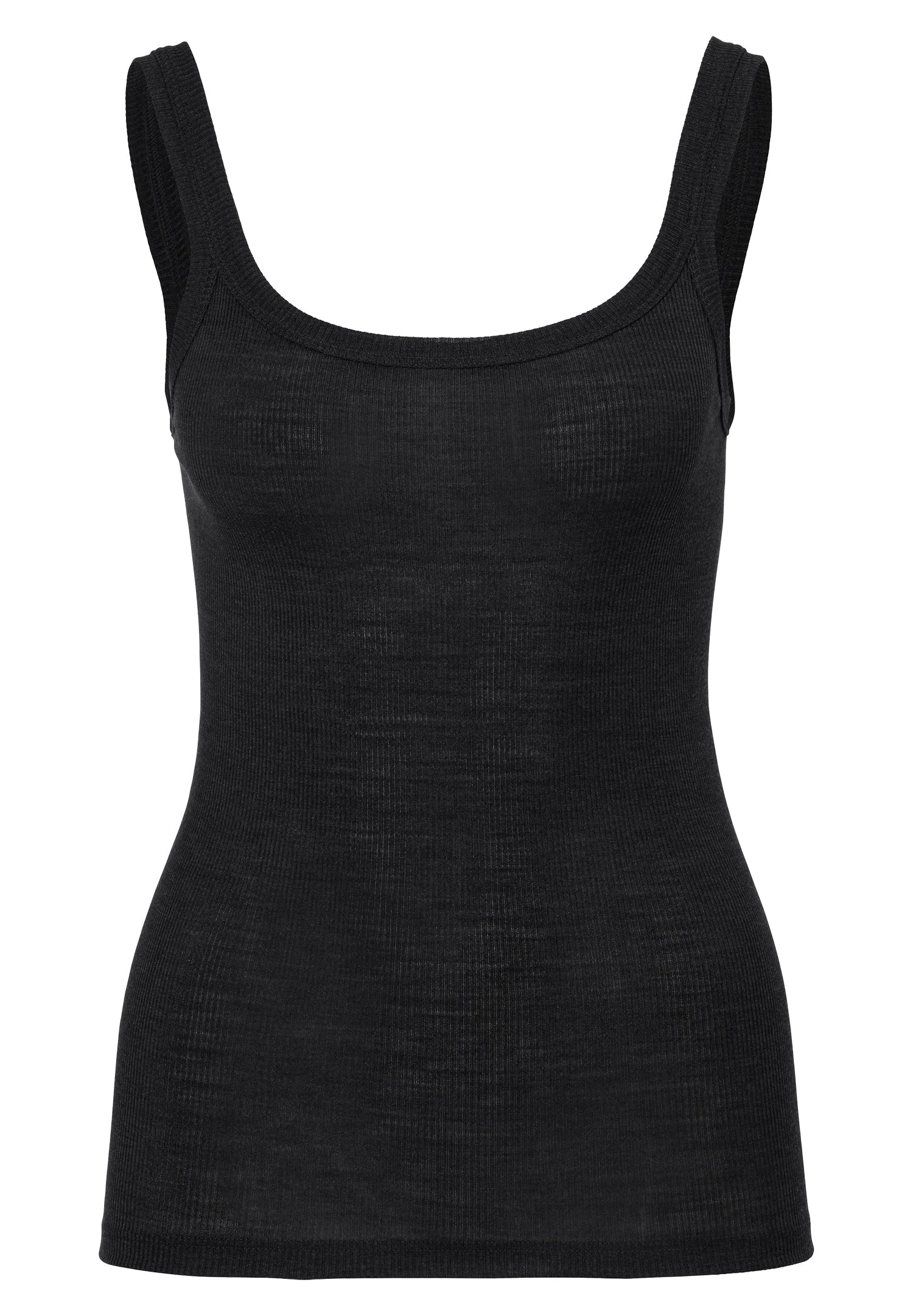 Fine rib fabric with a subtle structure and made of fine wool-silk material in a modern, straight look. The top with wide straps for women impresses with its deep round neckline set with wide edging bands. With no side seams at all, the fabric hugs your body seamlessly as it is made using the circular knitting method.